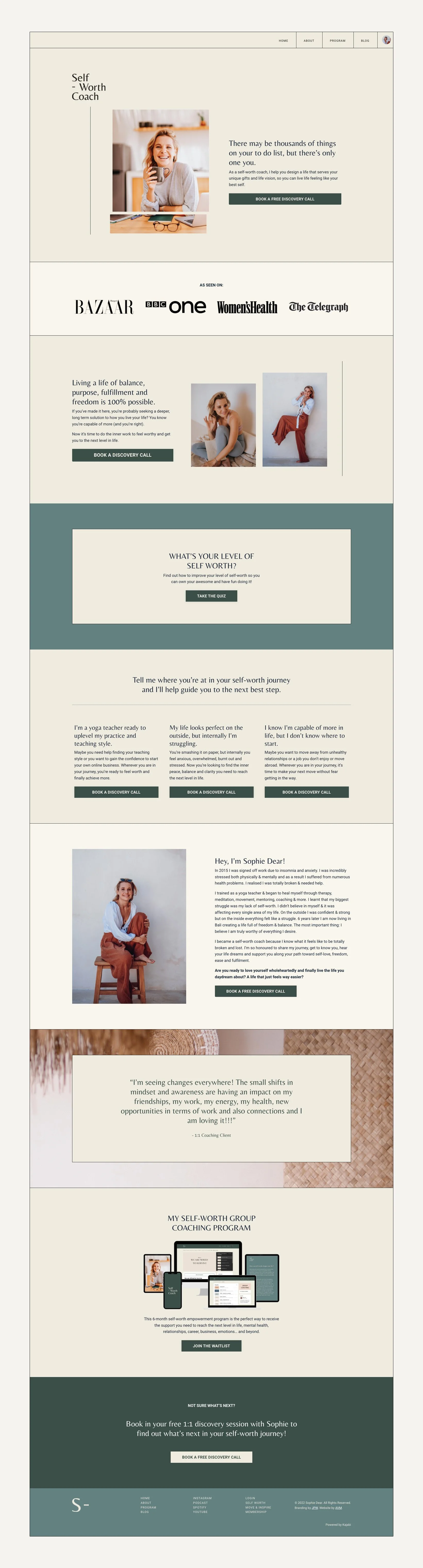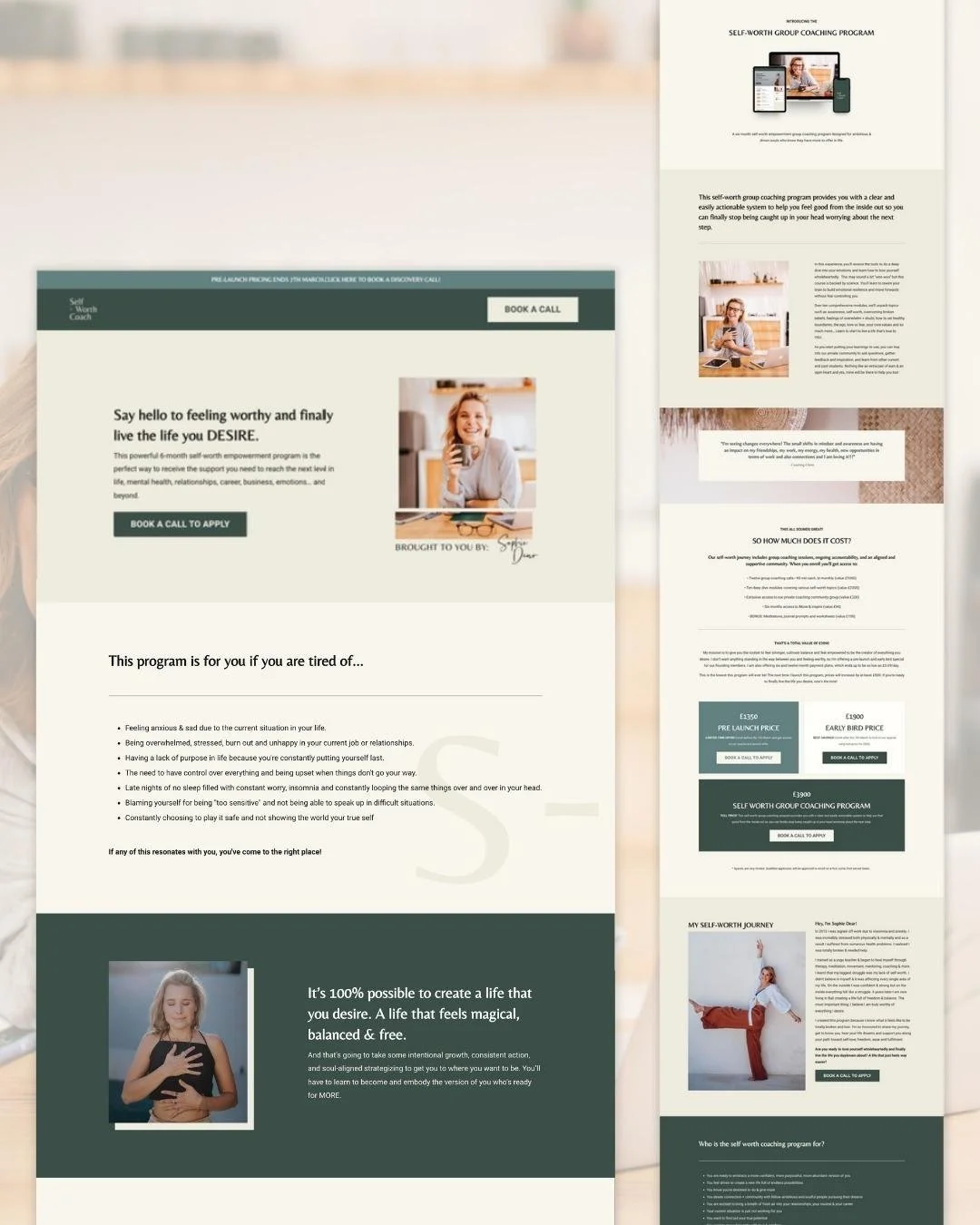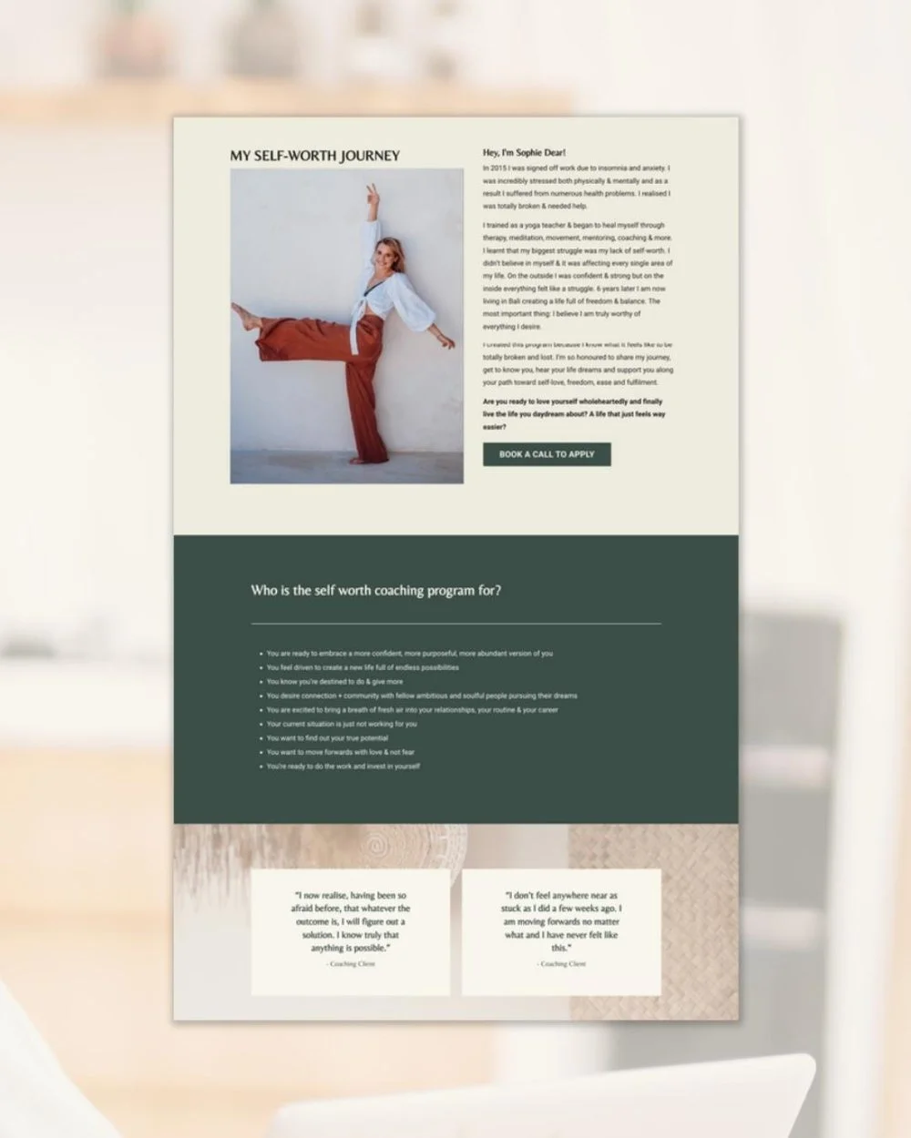 This Kajabi sales page was designed for Sophie Dear, a self-worth coach. The self-worth group coaching program is designed for ambitious & driven souls who know they have more to offer in life. Our goal for this landing page was to communicate that a life that feels easy, balanced & free is 100% attainable.