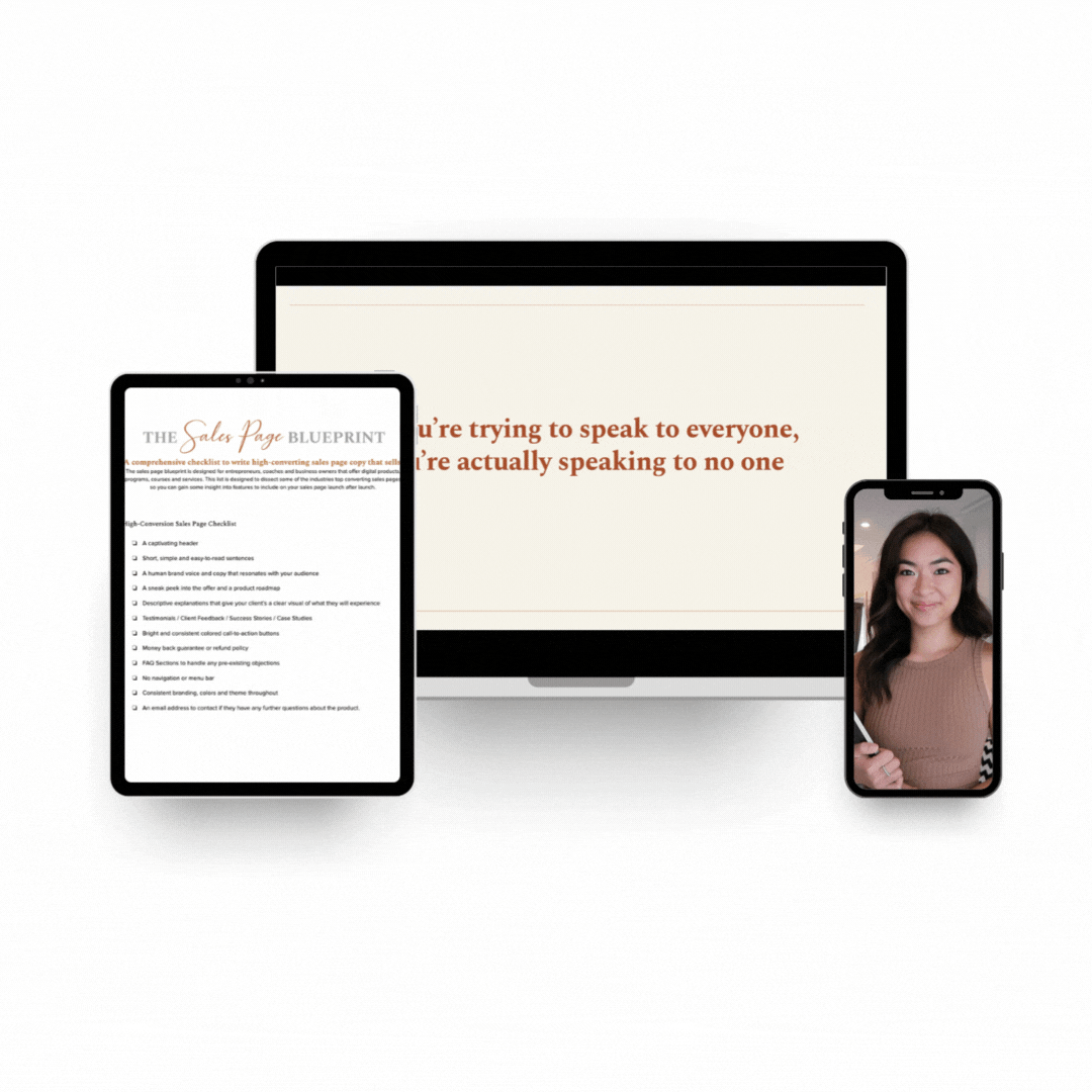 The Sales Page Blueprint was designed to give you the framework to discover your unique brand voice, confidently write your sales copy and drive more sales to your checkout pages.